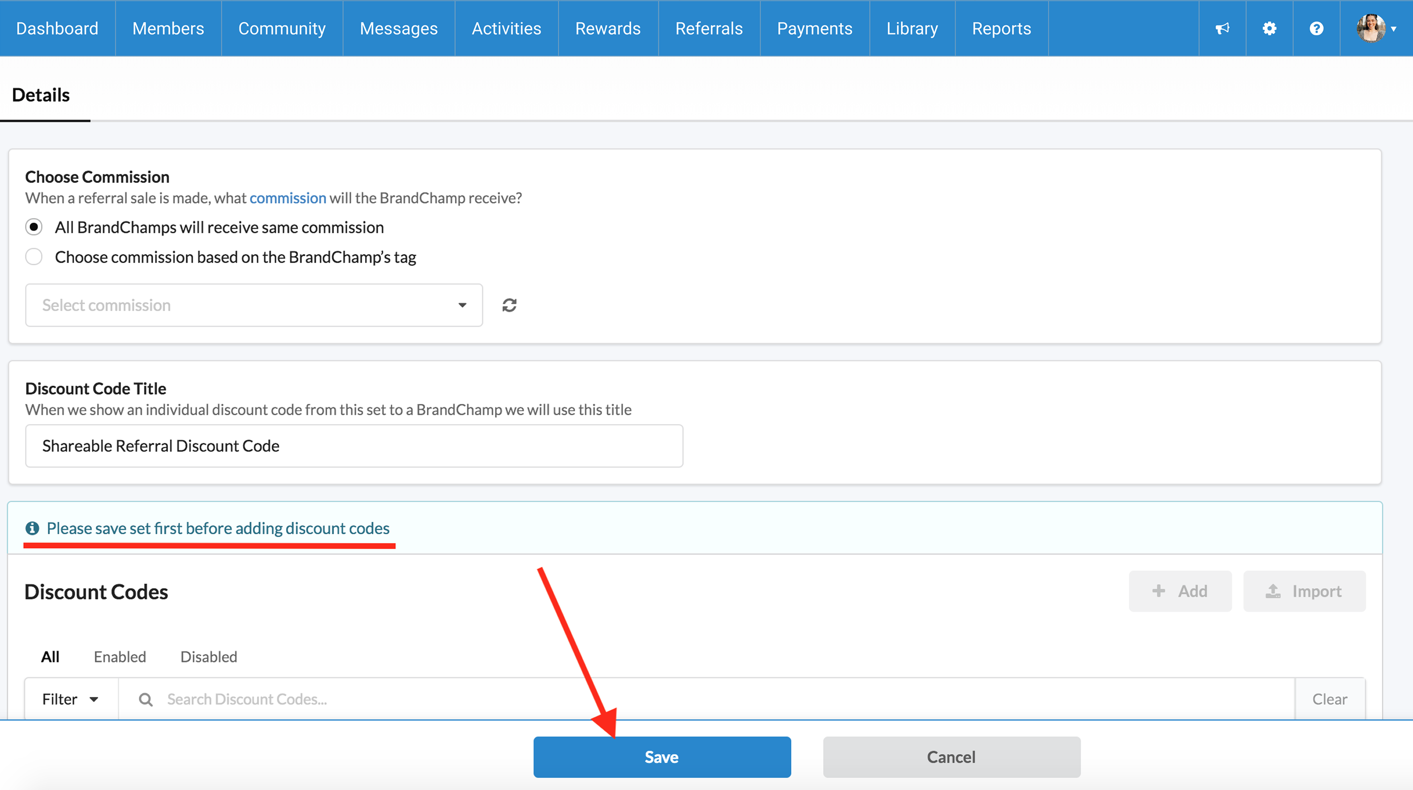 In the Referrals -> Discount Code Set section, you can import your BrandChamp’s discount codes and set the commission they will receive when their discount codes are used in your store. These discount codes will later be shown in the BrandChamp portal for your BrandChamp’s to share with their followers.