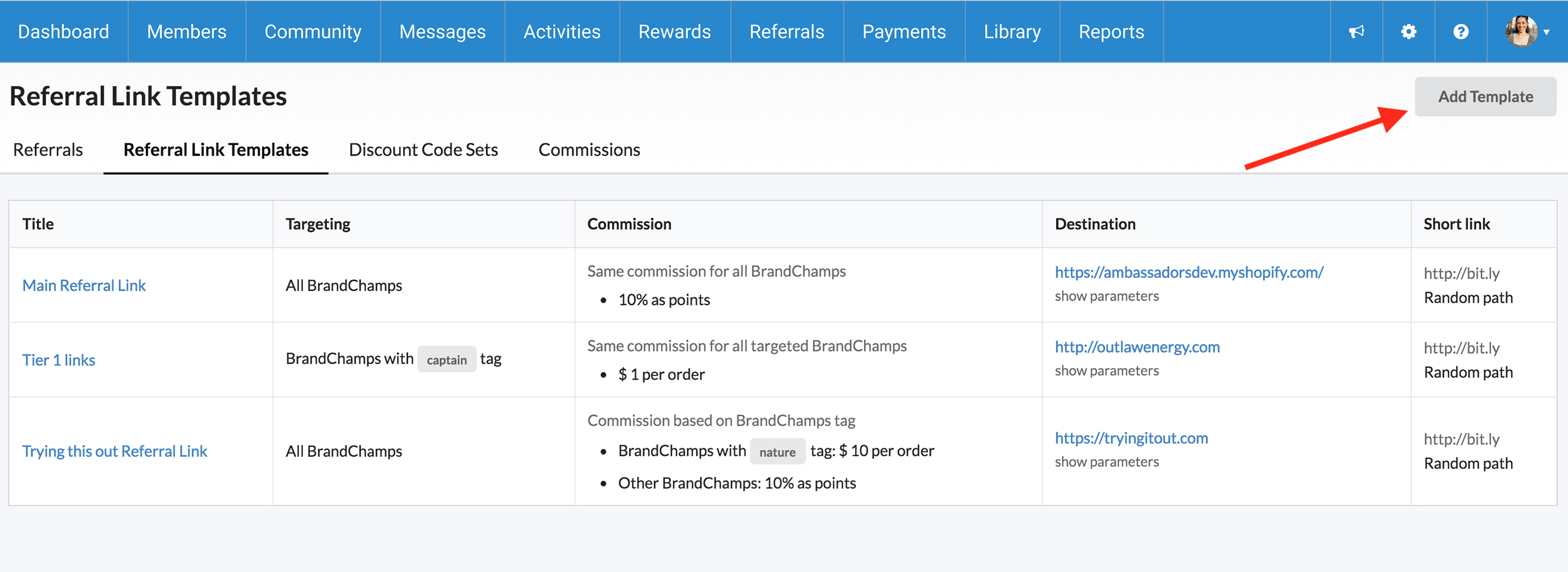 To create a referral link, click “Add Template” on the right side of the page.