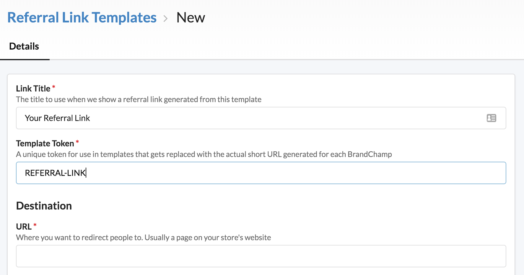 This will be covered later in more detail but briefly if you have a template with the text "Check out this awesome store! {{TL:SHOPIFY-REF-LINK}}", when a BrandChamp views it either in their email client or in their portal, the "{{TL:SHOPIFY-REF-LINK}}" text will have been replaced by the unique short URL generated for that BrandChamp for this particular tracking link template.