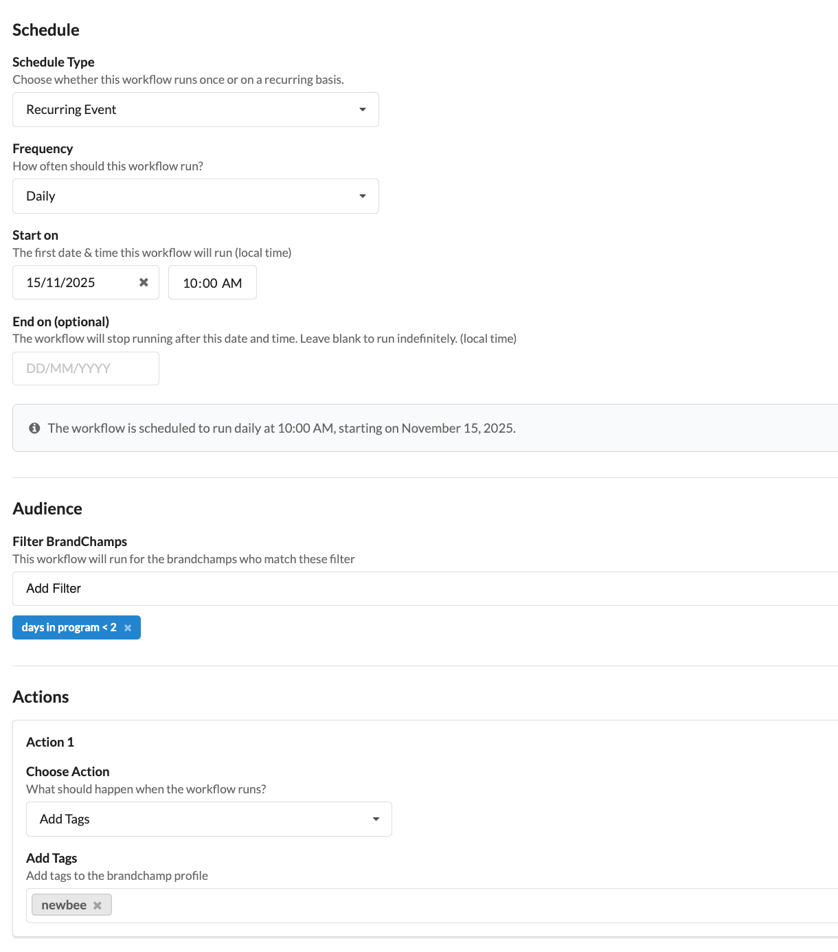 In our initial release, this feature allows you to automatically add, remove or replace tags from your BrandChamps. You can target users with powerful filters (like activity, status, or existing tags) and run these actions on a one-time or recurring basis.