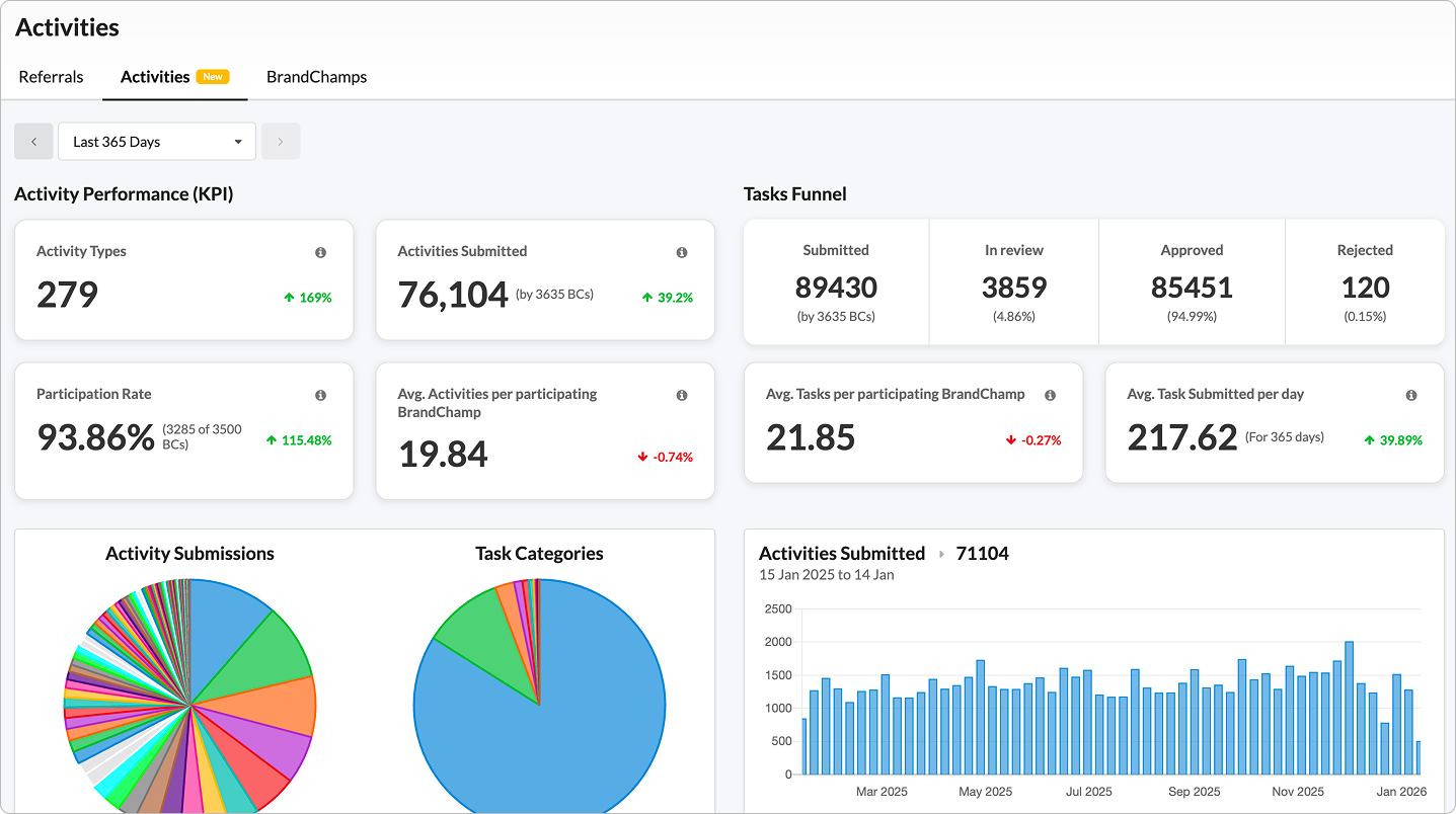 The Activity Report gives admins a clear, actionable view of how BrandChamps are engaging with activities over time. It combines high-level KPIs, task processing health, engagement mix, and detailed drill-downs so you can quickly assess program performance and take action.
