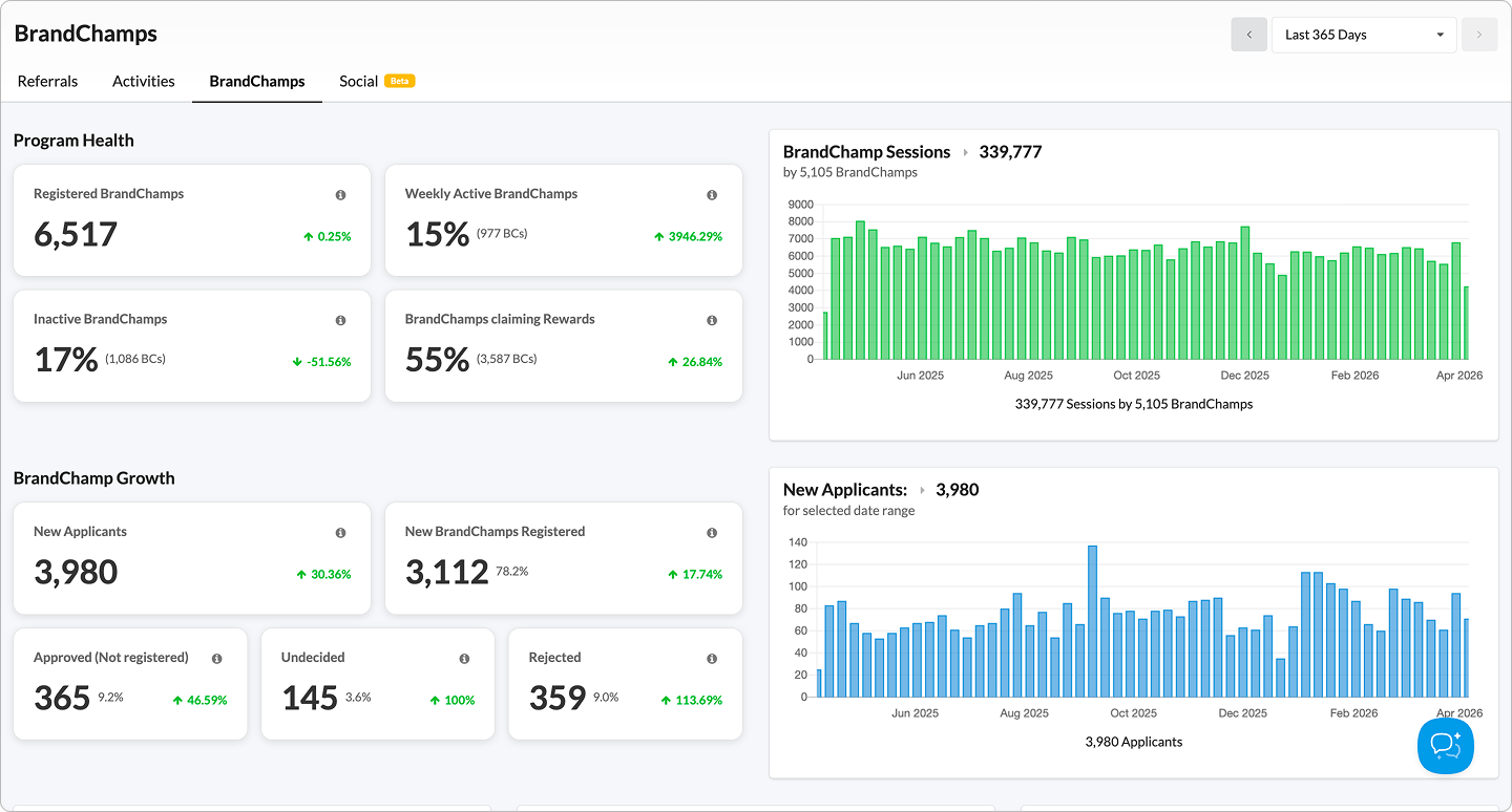 The BrandChamp Report gives you a clear, structured view of how your program is growing, how active your BrandChamps are, and how engagement, referrals, and rewards are distributed across your community.