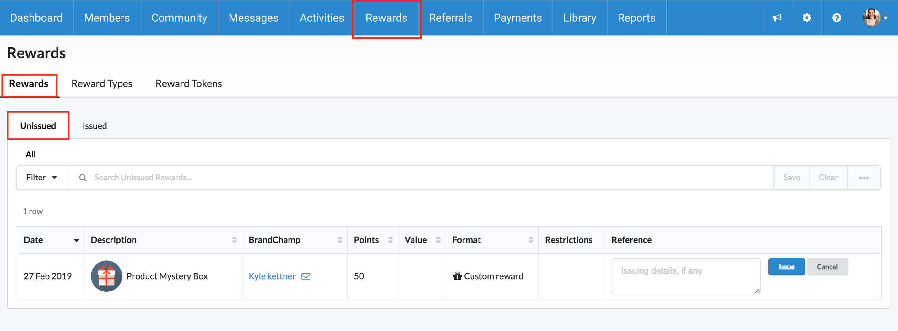 You define what rewards are available to be claimed by BrandChamps in the Reward Types tab under the Rewards page.