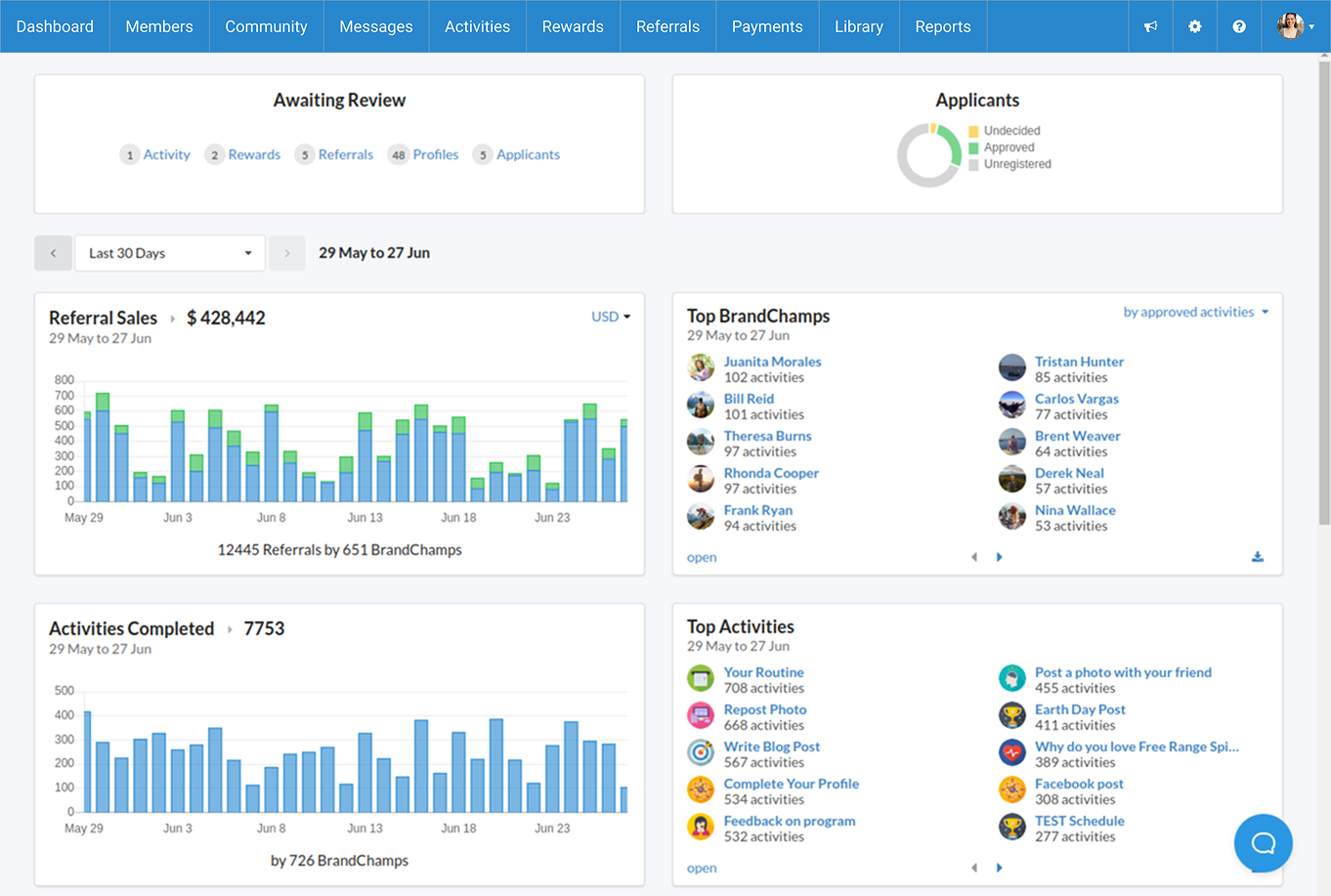 If an applicant is approved, they become a "BrandChamp" and gain access to the BrandChamp portal to review and complete Activities that you set for them, view and claim available Rewards, update their Profile, review referral information, and more.