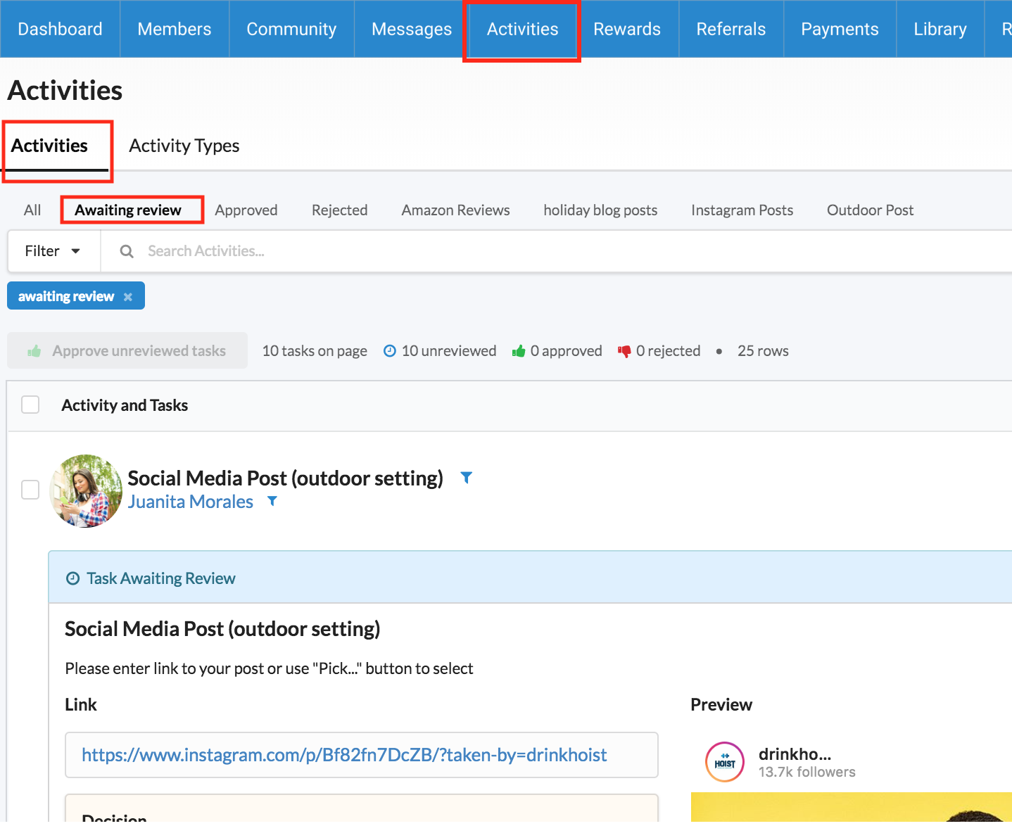 Each task completed by a BrandChamp must be reviewed by one of your administrators before it can be marked as approved. Only when all tasks for an activity have been approved does the reward associated with the activity get credited to the BrandChamp.