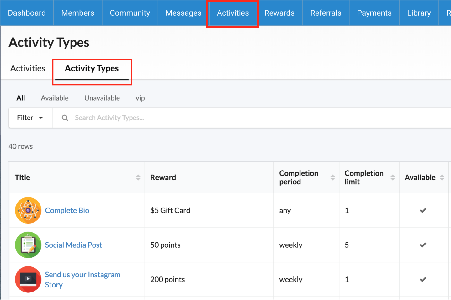 Activities are built in the Activity Types tab on the "Activities" page of the admin site. An activity type defines the tasks to be done, how they will be verified, how often an activity can be completed, the reward for completion, etc.