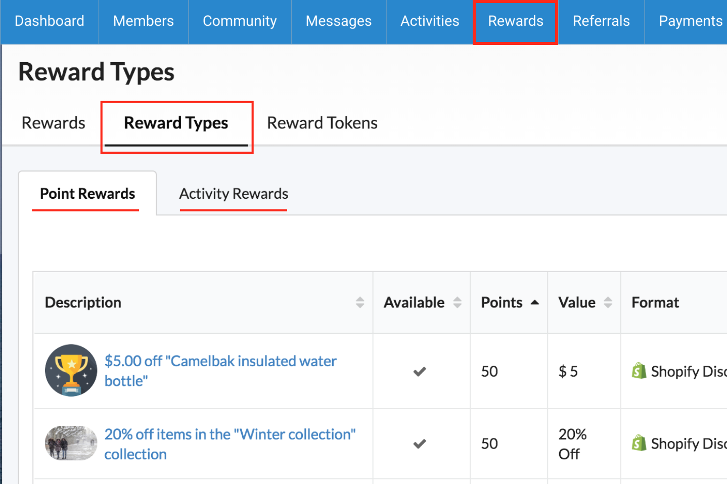 The Point Rewards tab lets you set up rewards that can be claimed in exchange for a set number of points.