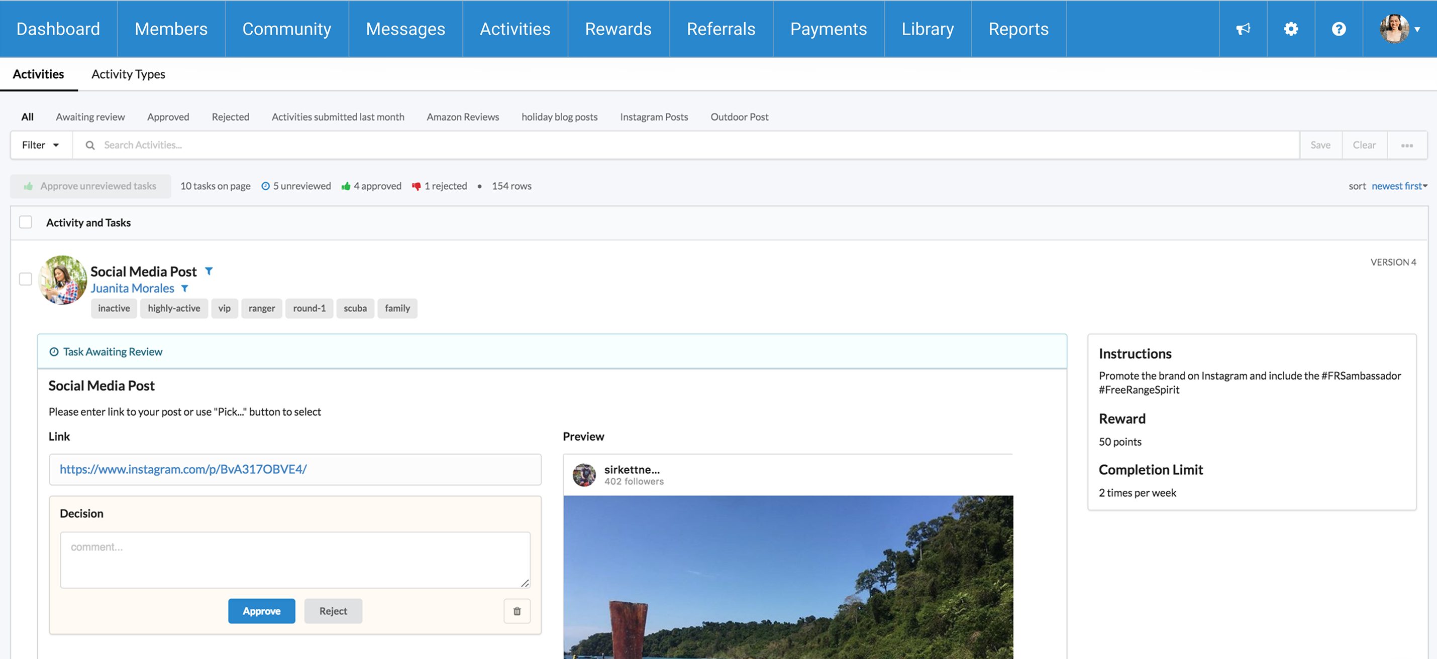 When rejecting a task, you'll want to leave a comment explaining to the BrandChamp why their activity has been rejected