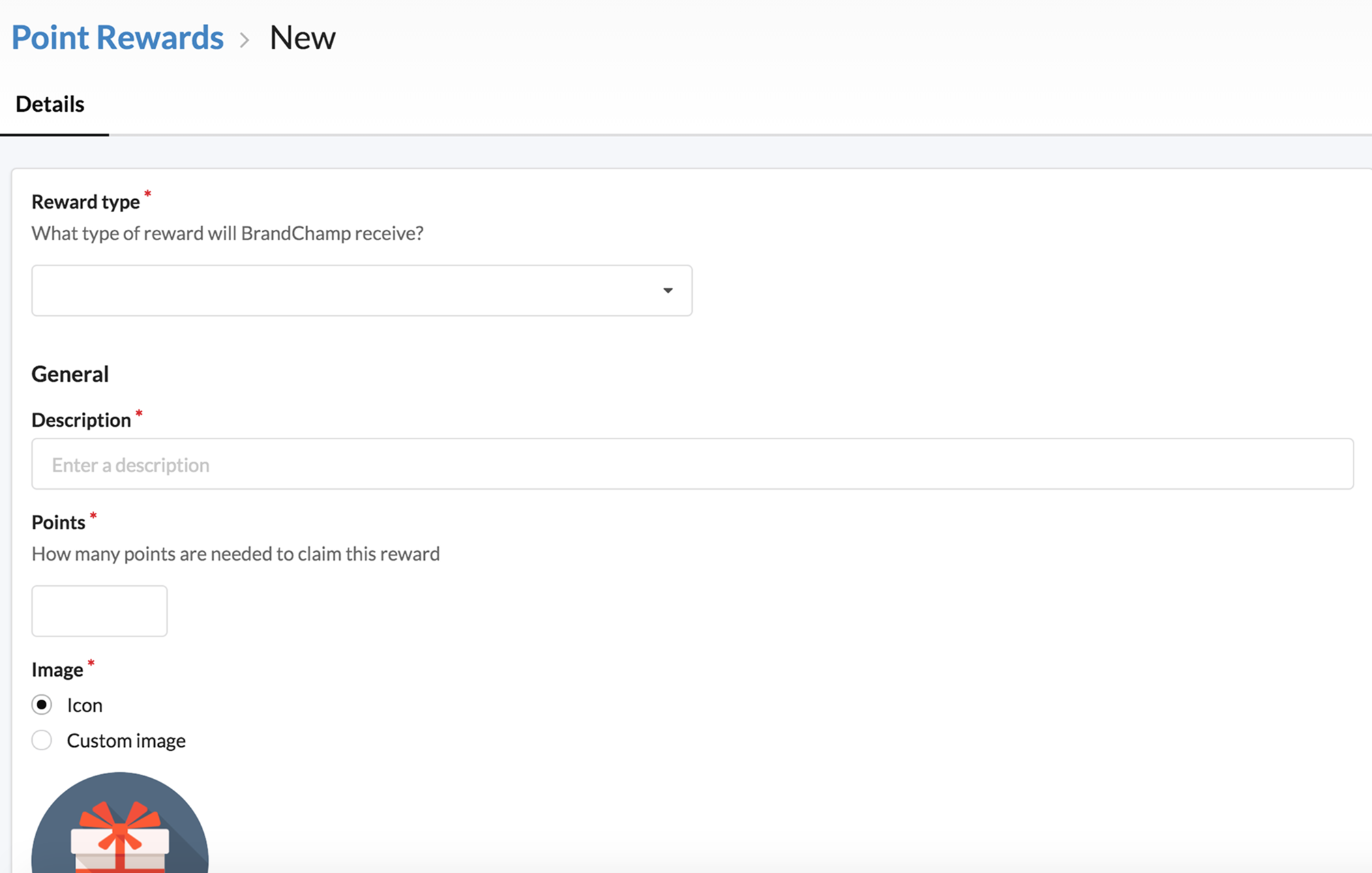If you click the Reward Type dropdown, you'll see the available types of rewards that can be given to BrandChamps in exchange for the number of points we've defined: