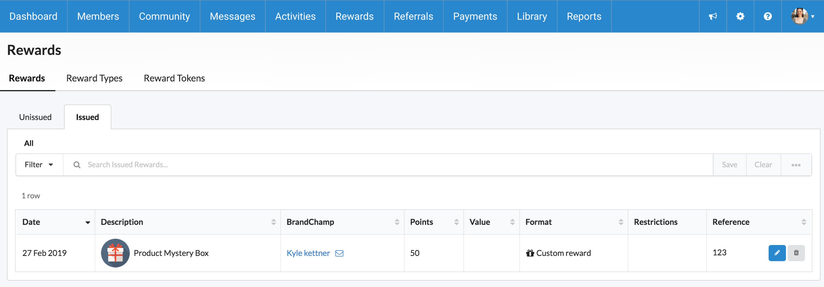 The "Reference" field allows us to provide the BrandChamp with the information needed in order to claim the reward. For example, we could enter a discount code here if this was a product discount reward type. As it's a Custom reward and for the sake of this walk-through, let's enter "123" and click "Issue."
