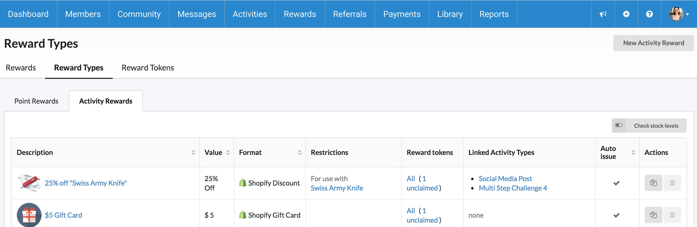 In the example above, we linked a social media post activity to a 25% off "Swiss Army Knife" voucher. The activity will look something like the following in the BrandChamp's portal: