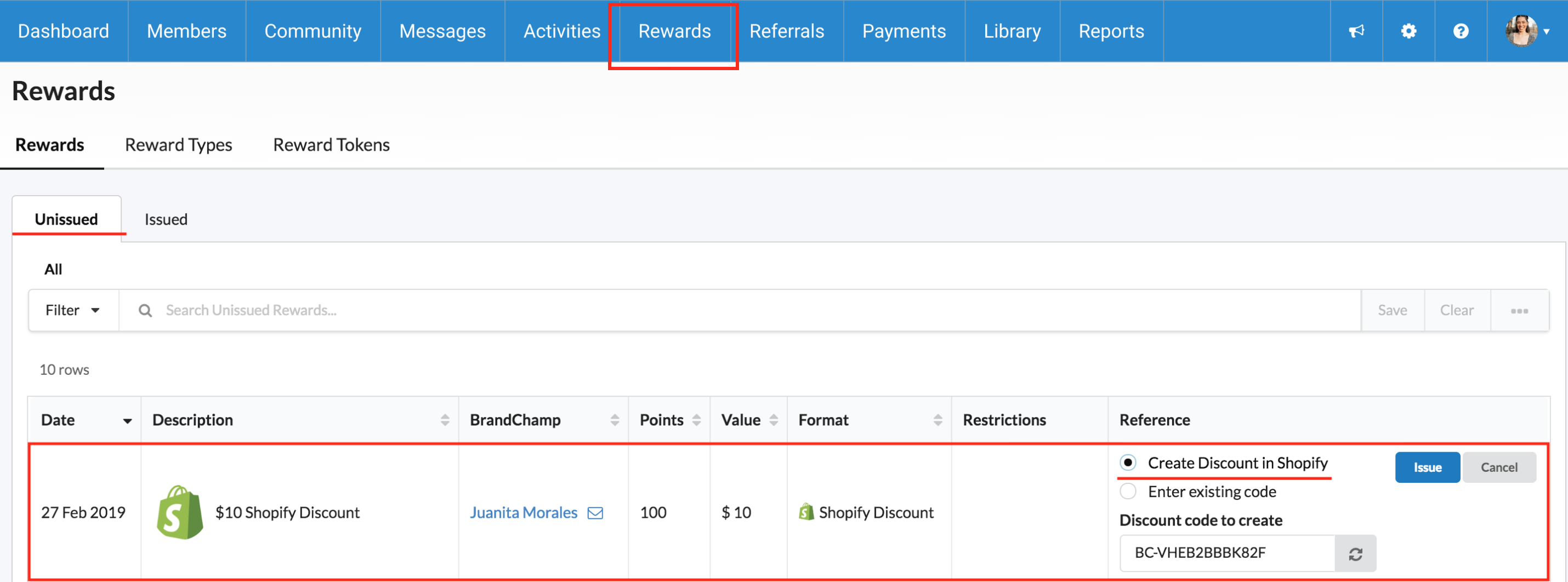 At this point, because it's a Shopify reward (which can be automatically created by the BrandChamp system), the admin can simply click the radio button for "Create Discount in Shopify," and BrandChamp will automatically create a discount code in the Shopify store and mark the reward as issued. It can then be viewed in the "Issued" tab: